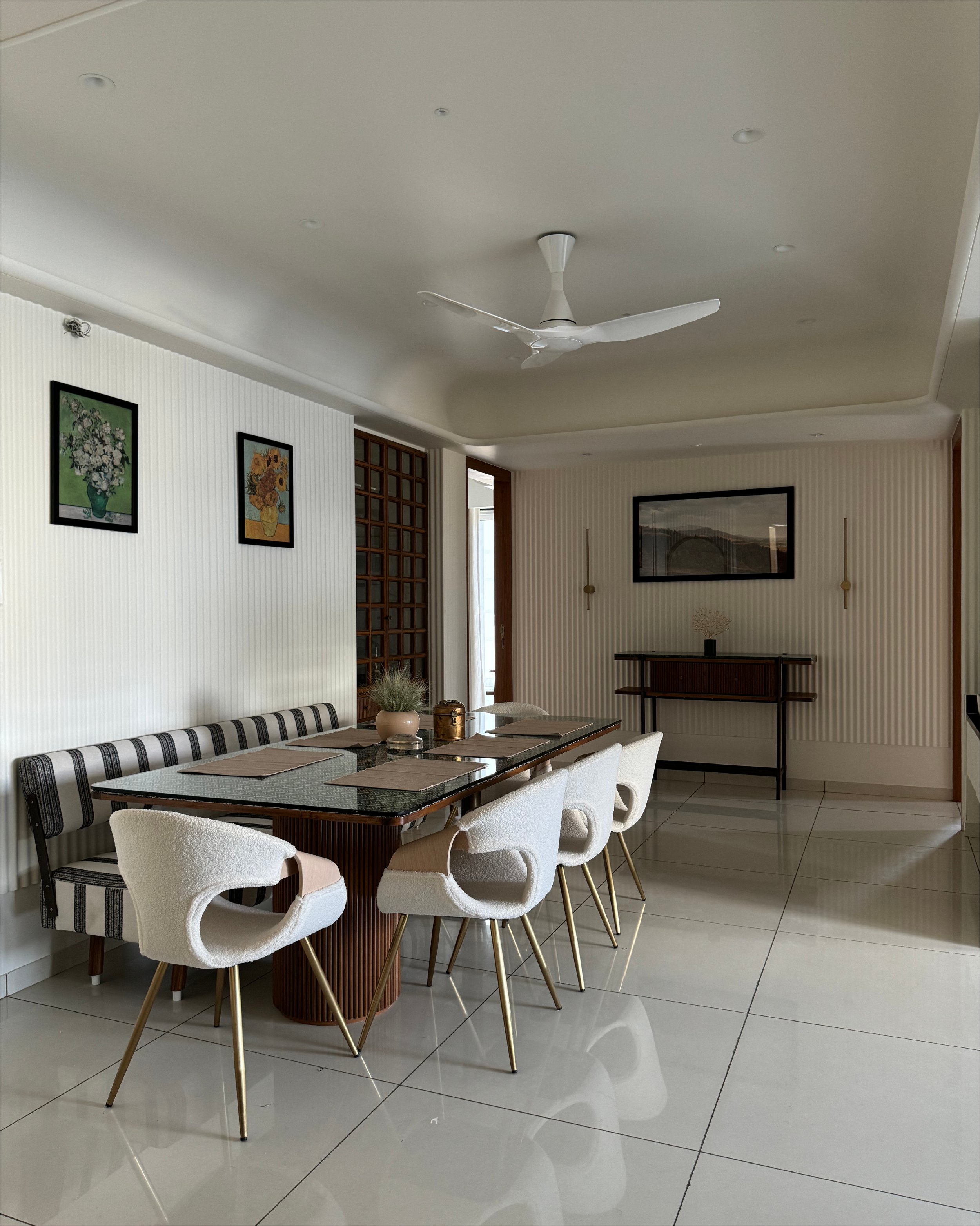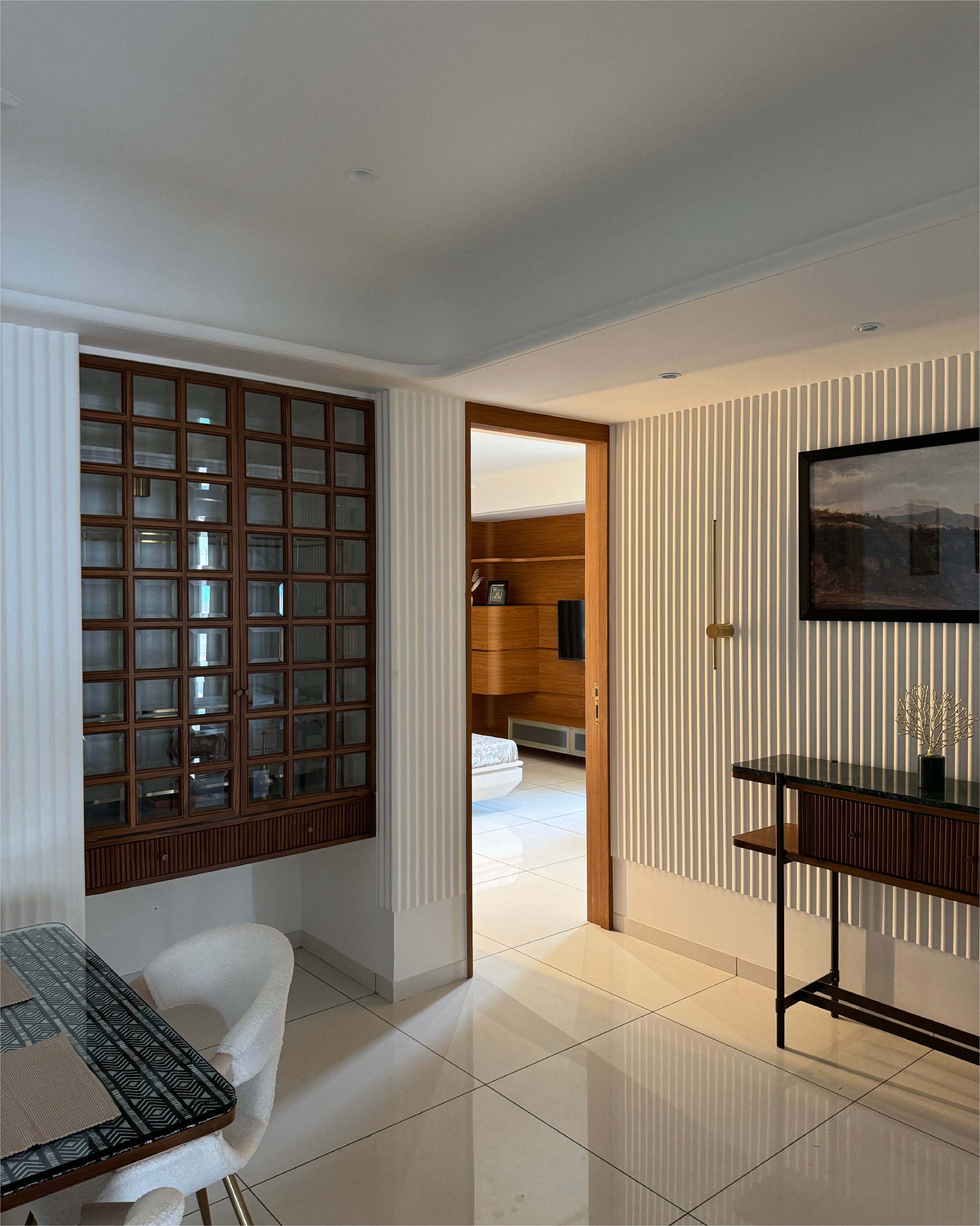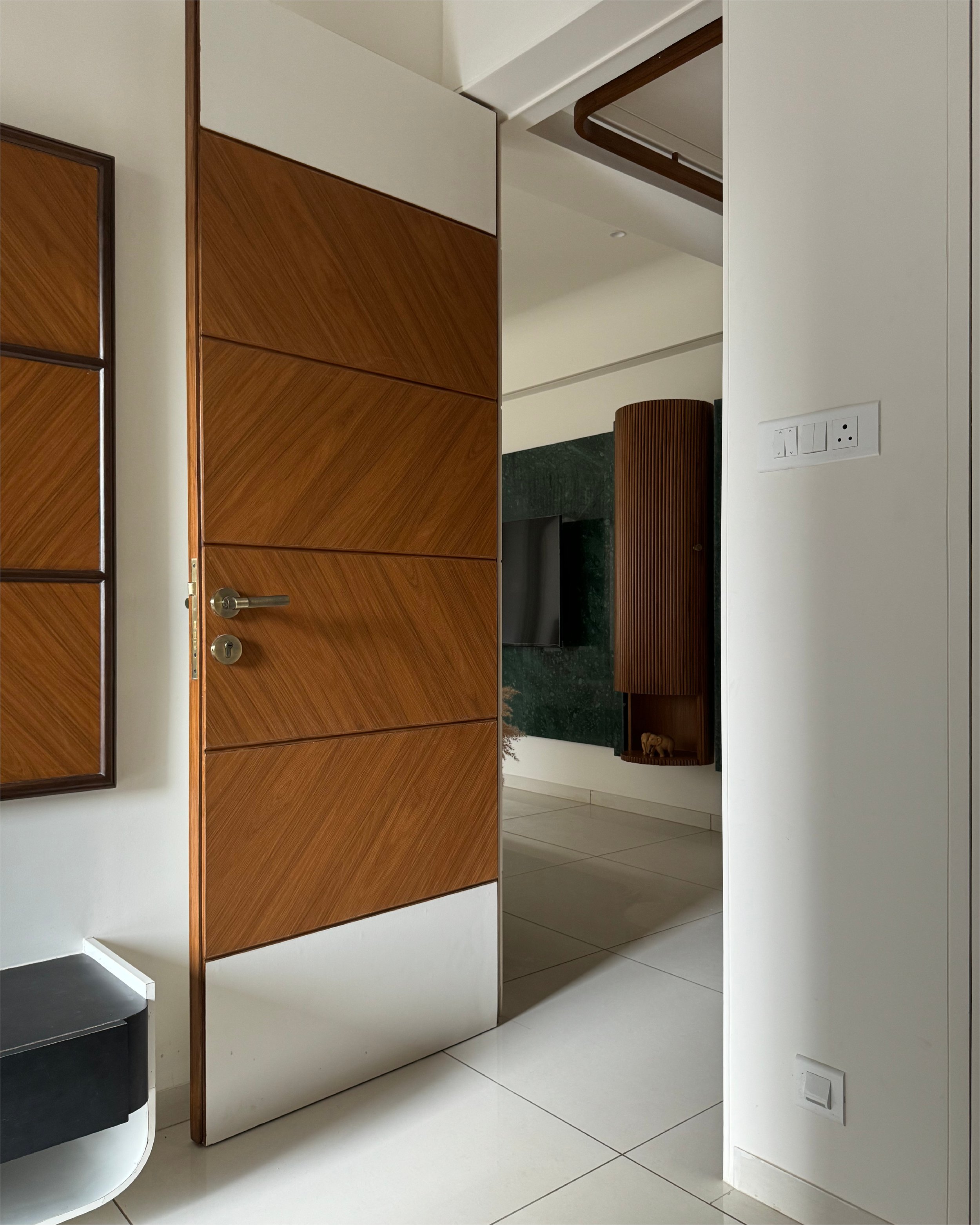 Warm oak-textured finishes pair seamlessly with soft-toned flooring, creating an inviting ambience. Richly upholstered furnishings in muted jewel tones add depth and a touch of luxury to the interiors. The design philosophy draws inspiration from Indian minimalism, subtly infused with hints of traditional craftsmanship, resulting in a timeless and balanced living environment.