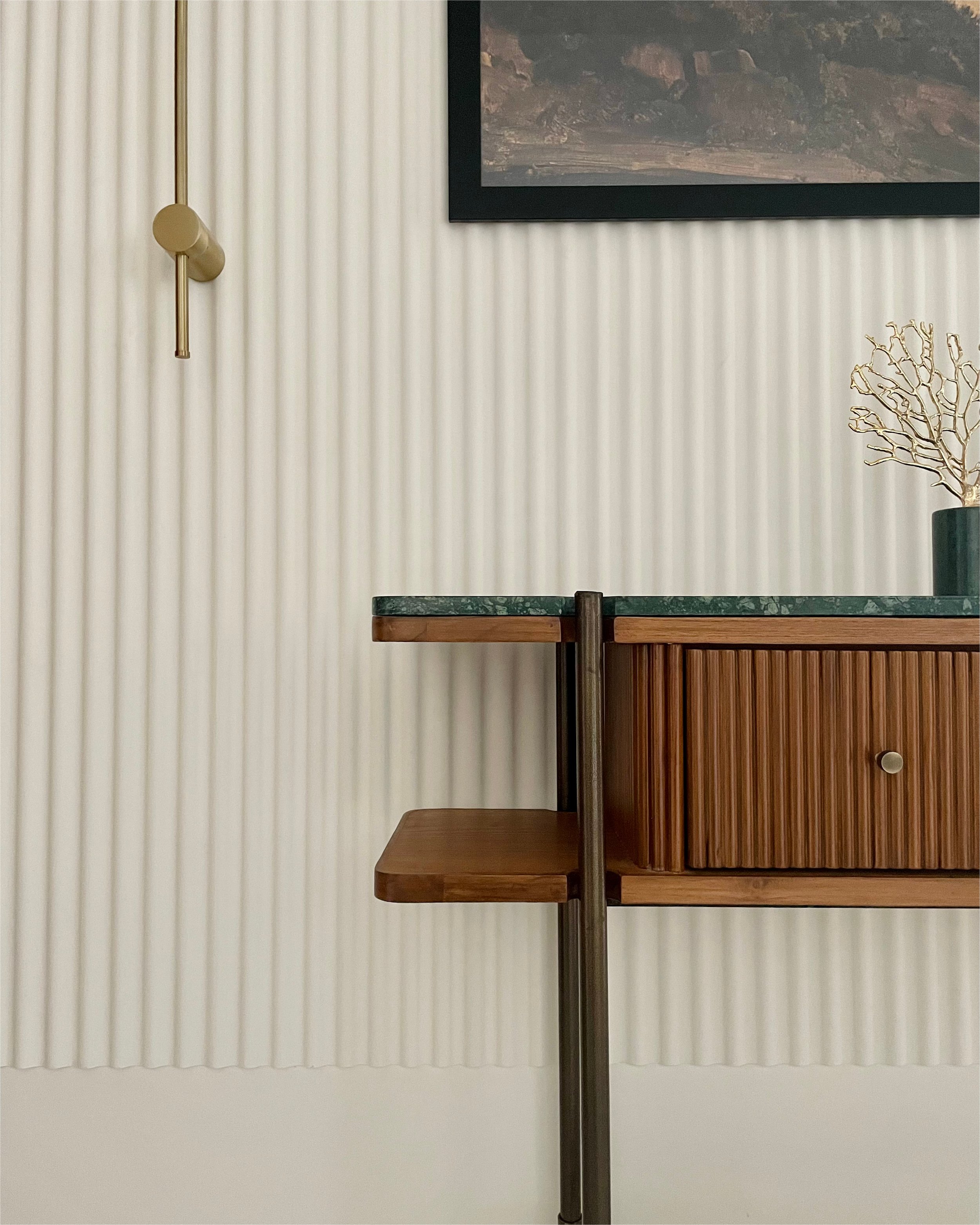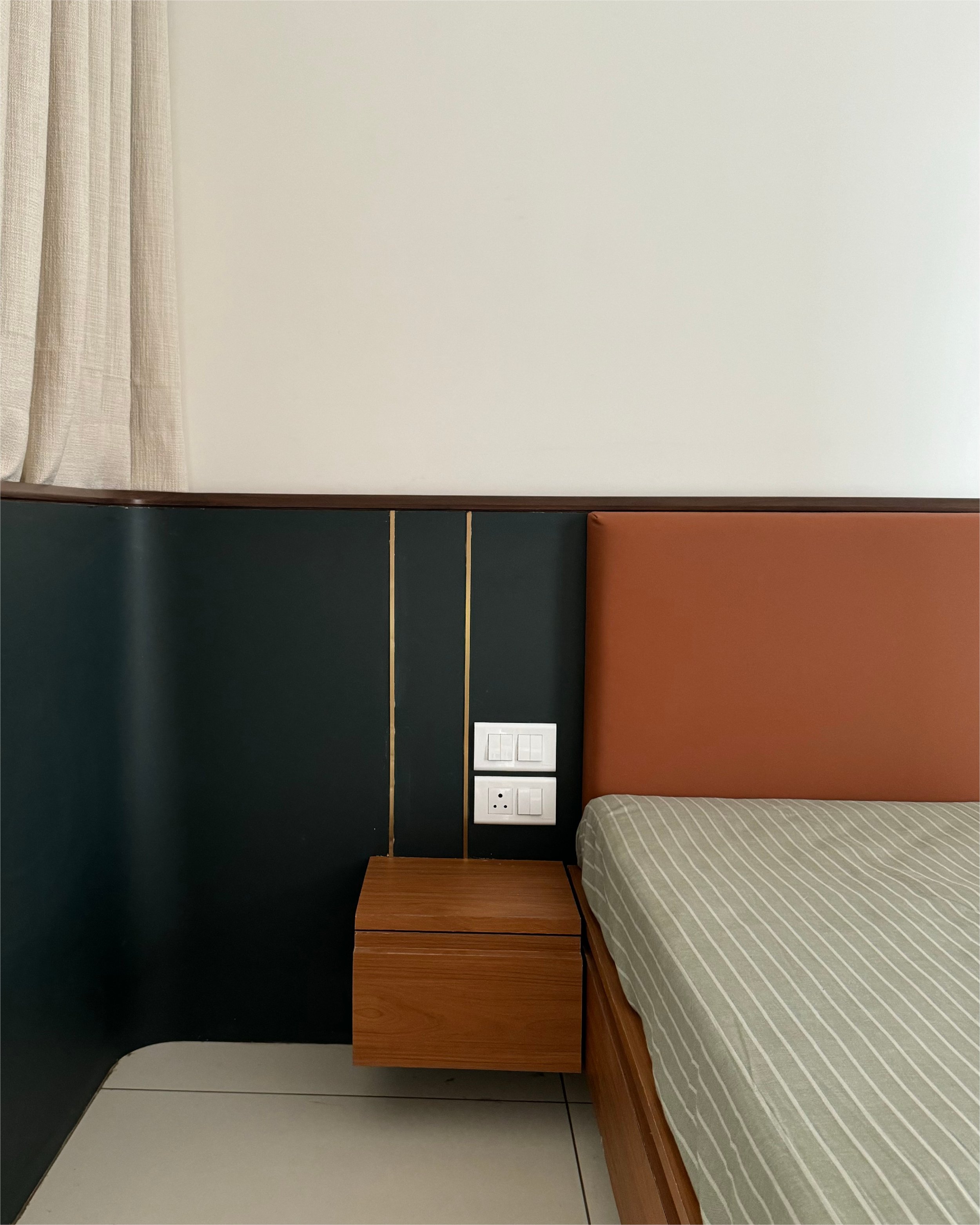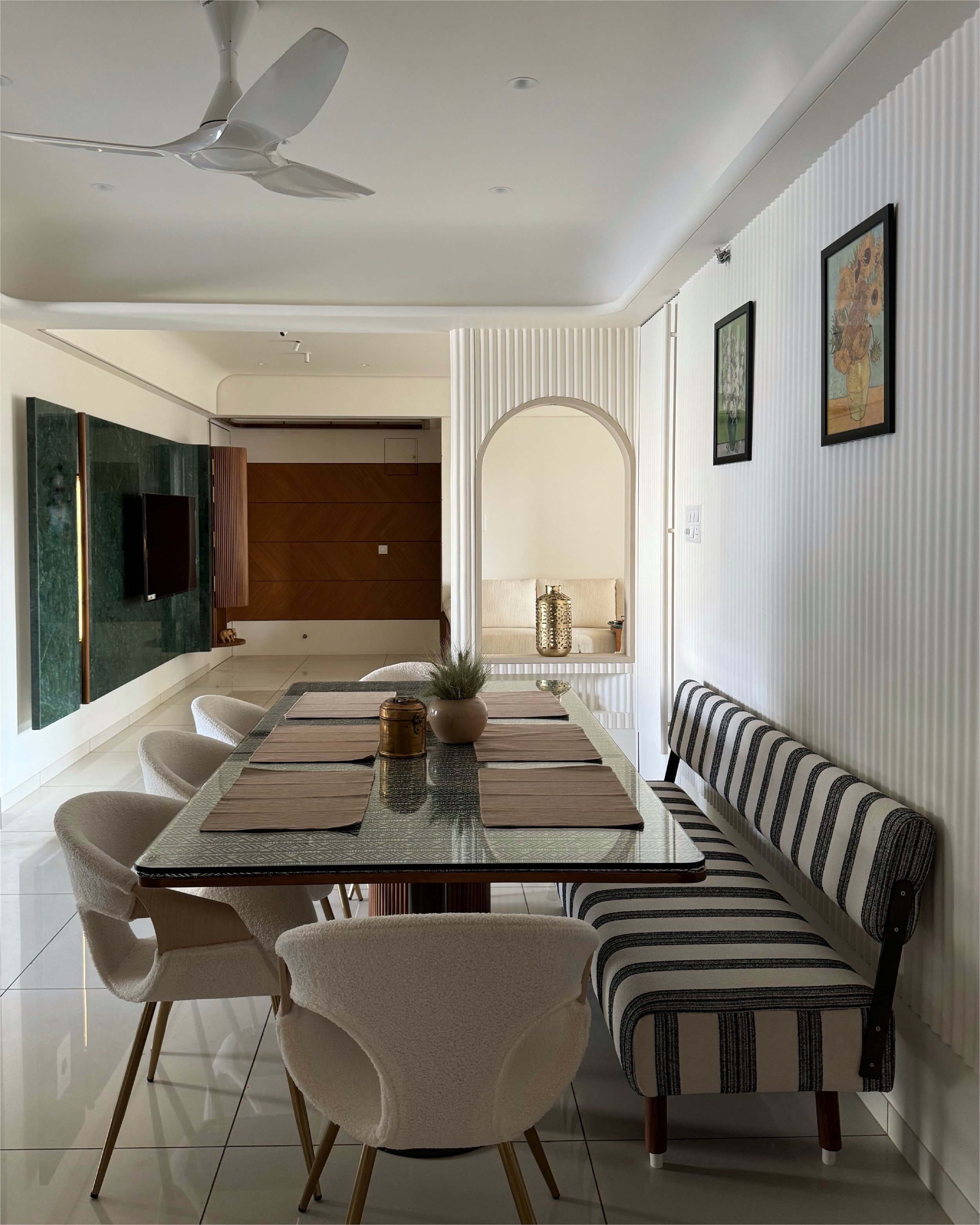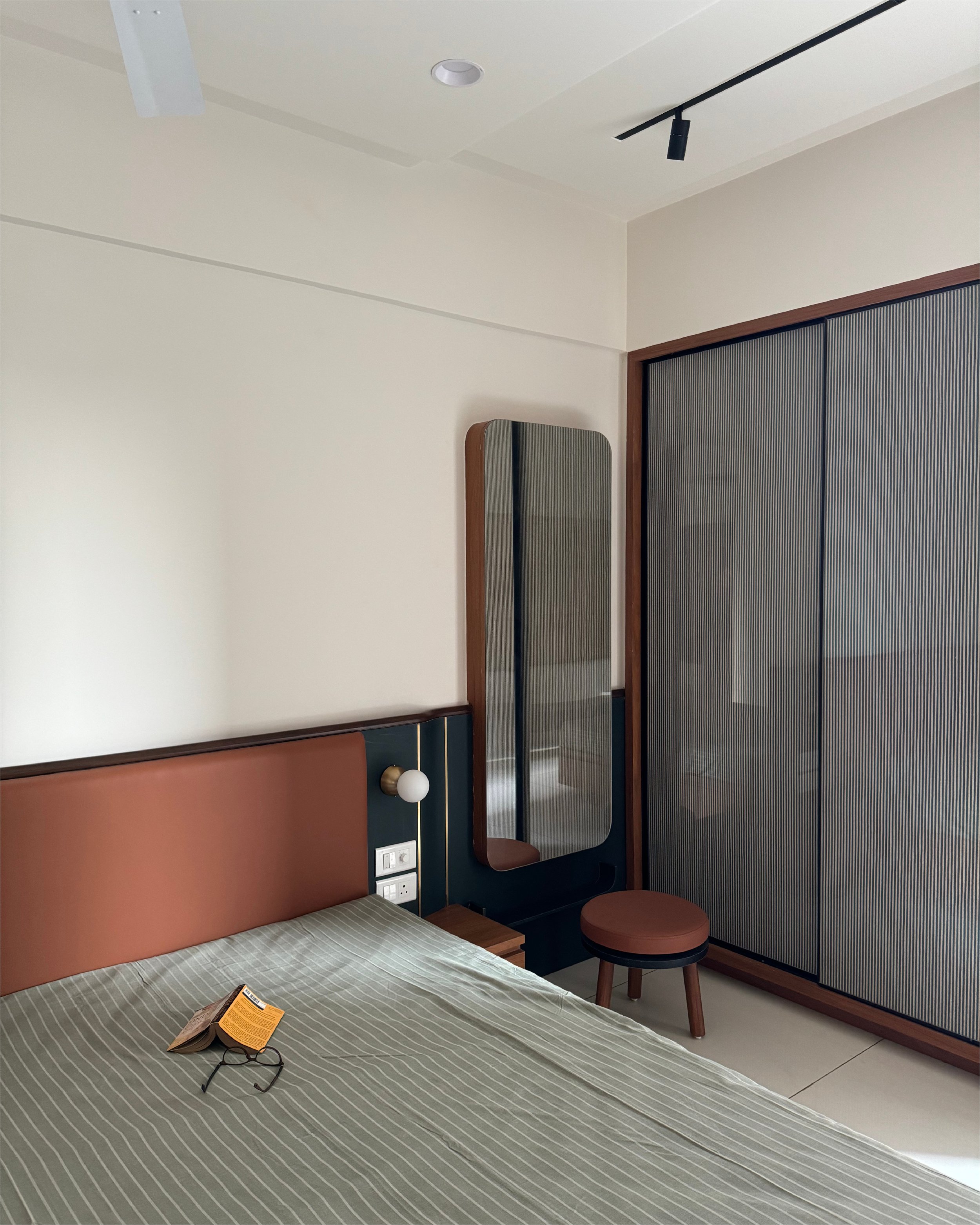 Warm oak-textured finishes pair seamlessly with soft-toned flooring, creating an inviting ambience. Richly upholstered furnishings in muted jewel tones add depth and a touch of luxury to the interiors. The design philosophy draws inspiration from Indian minimalism, subtly infused with hints of traditional craftsmanship, resulting in a timeless and balanced living environment.