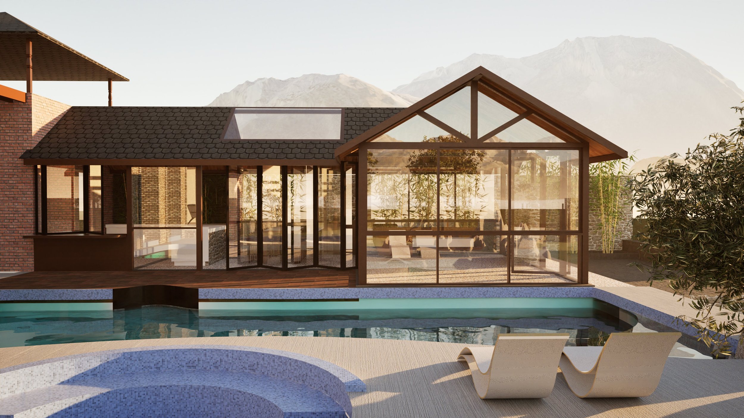 KWV offers three bedrooms, an activity room, a gym, and a glass outhouse, complemented by an organic-shaped swimming pool, a small tennis court, and versatile outdoor areas.