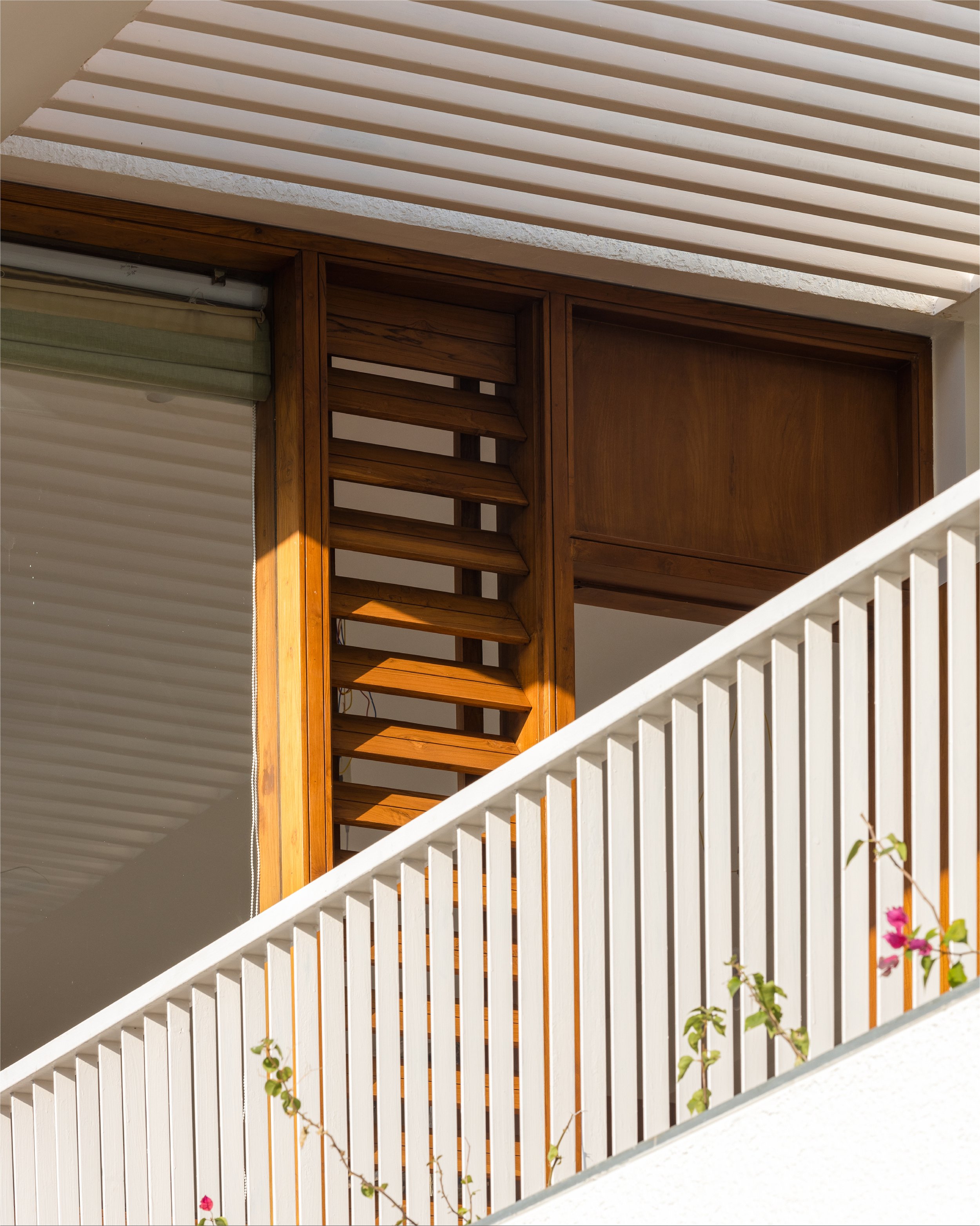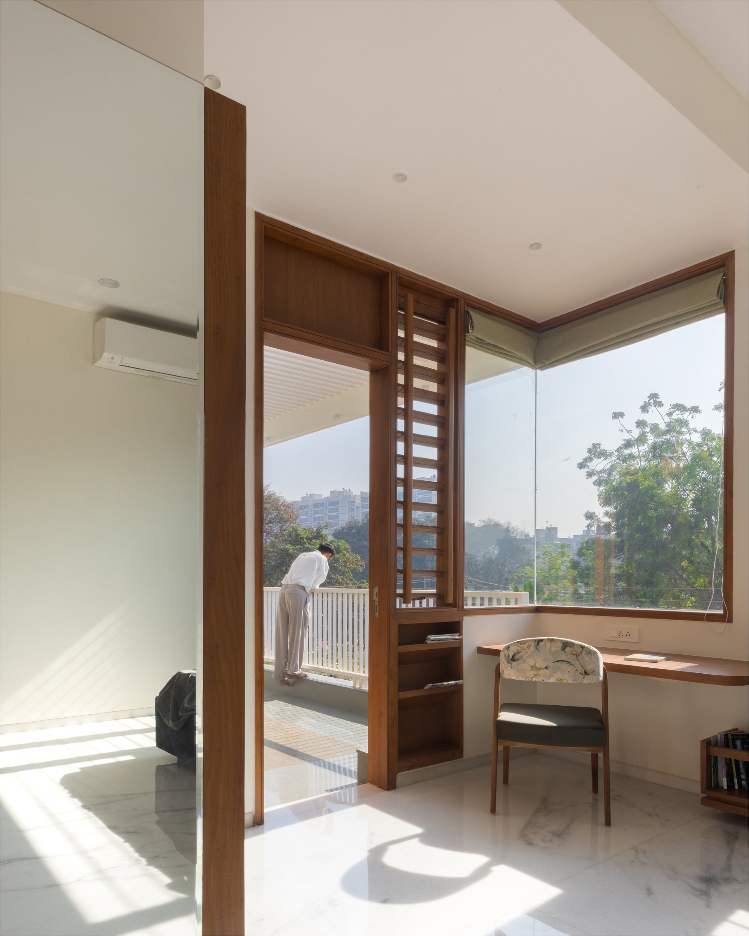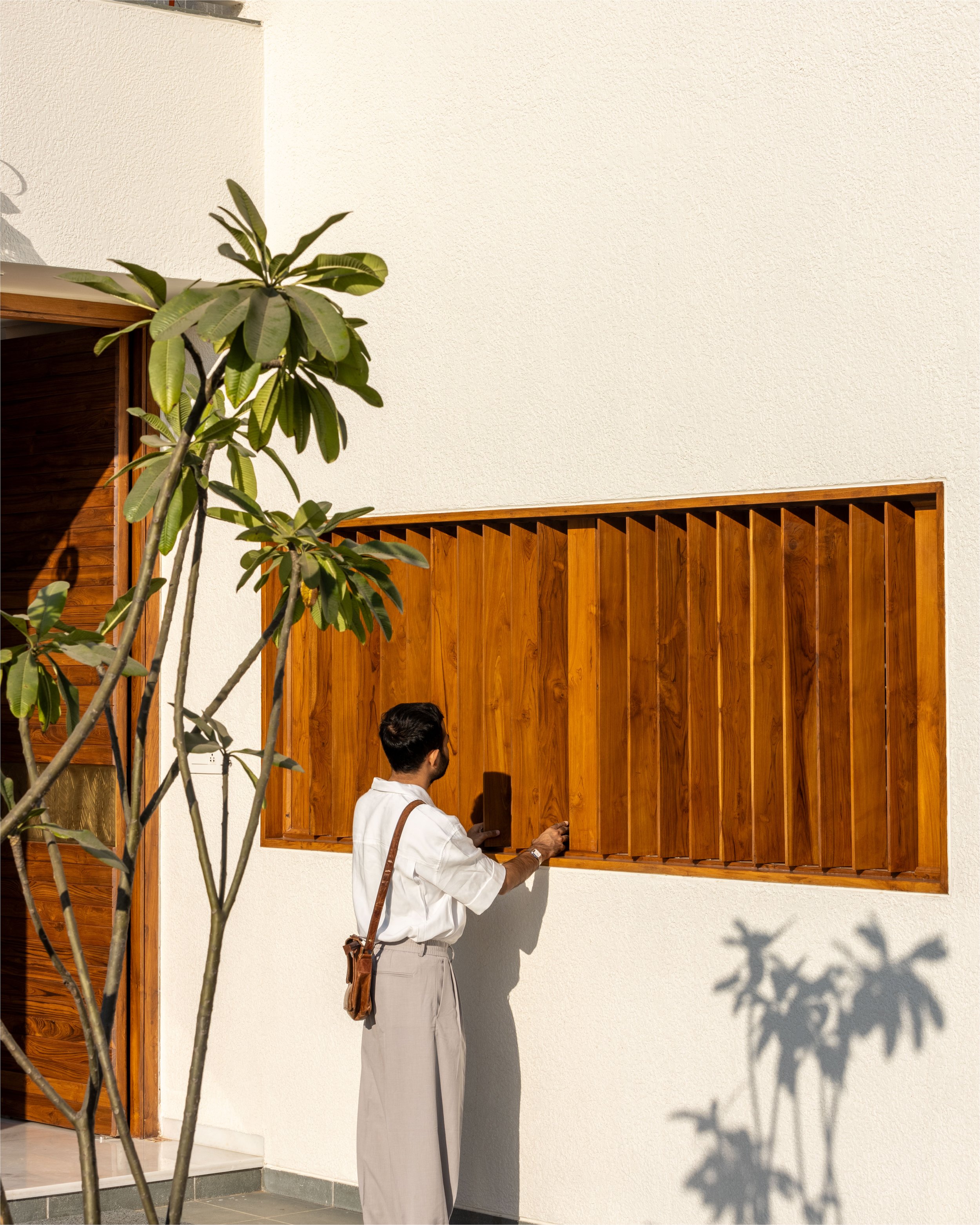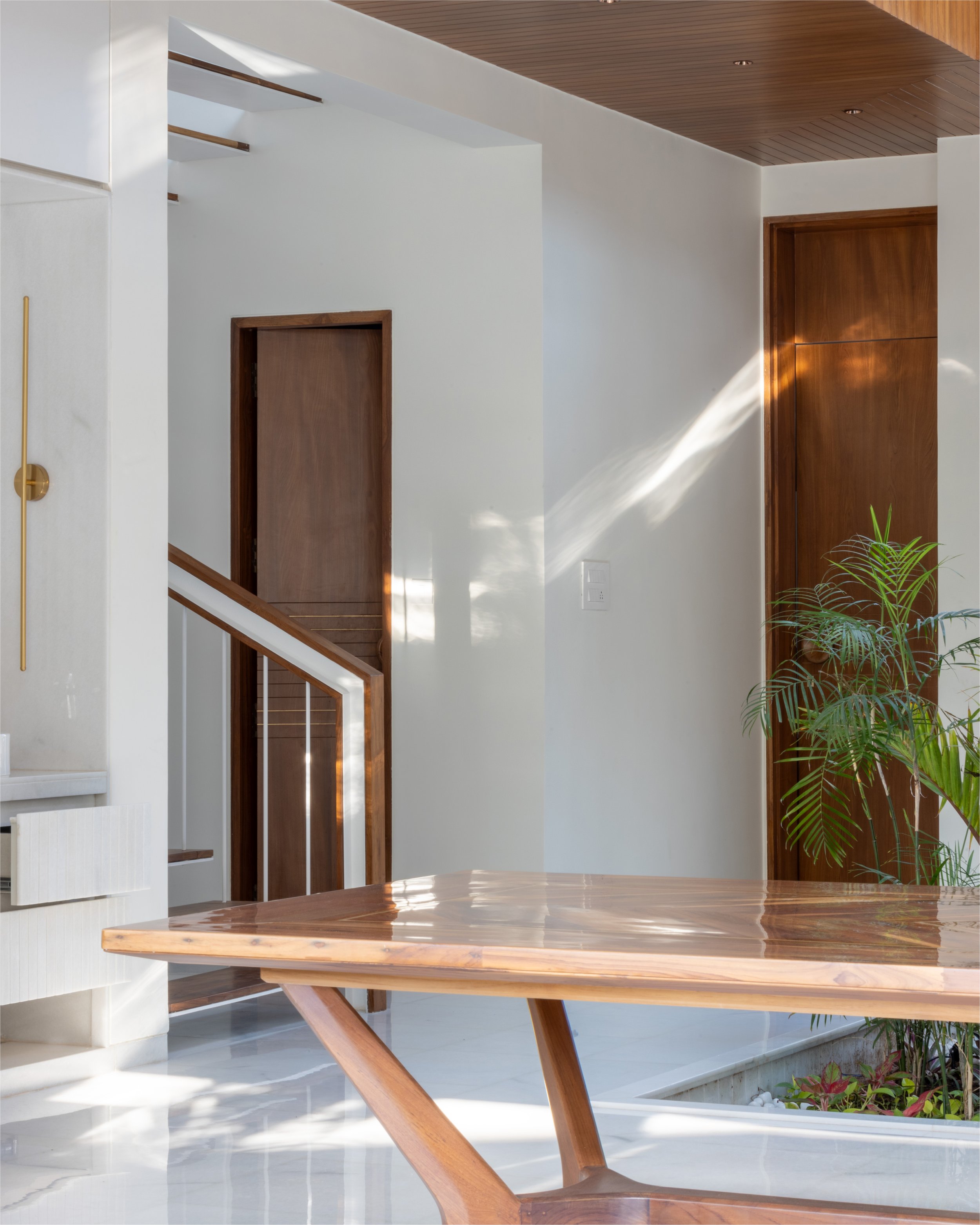 The doors and windows are made from reclaimed wood sourced from a demolished church in a nearby village. White walls and white marble, along with wood and plants make a more earthen Gandhian neutral palette. In this house, light plays with materials and creates a dynamic environment throughout the day, allowing users to occupy the house and make it into a home.