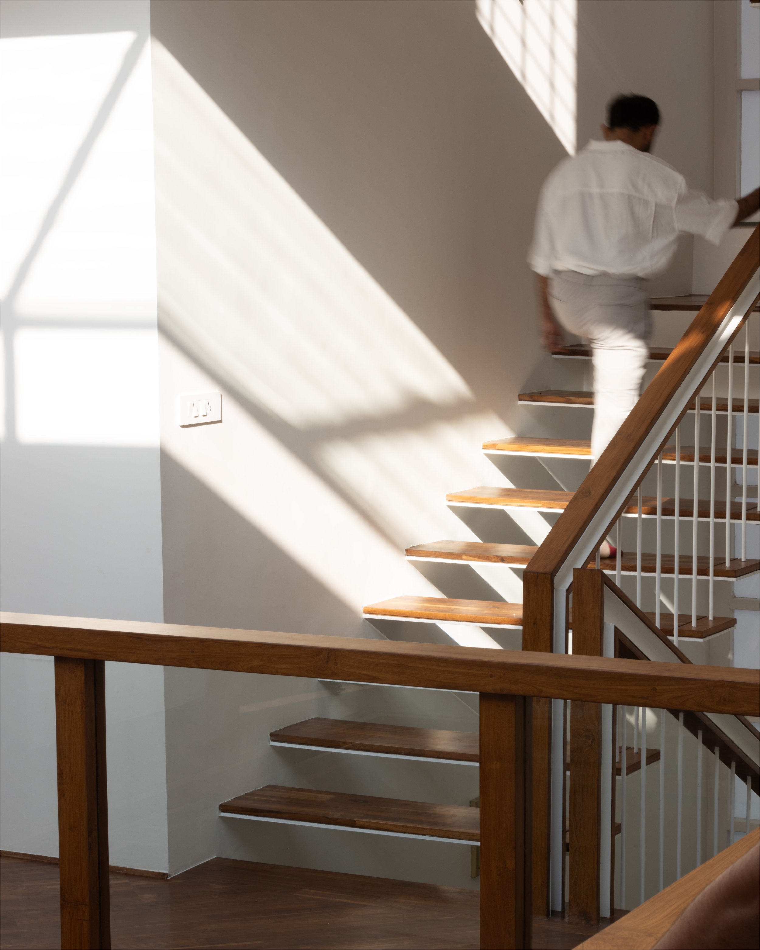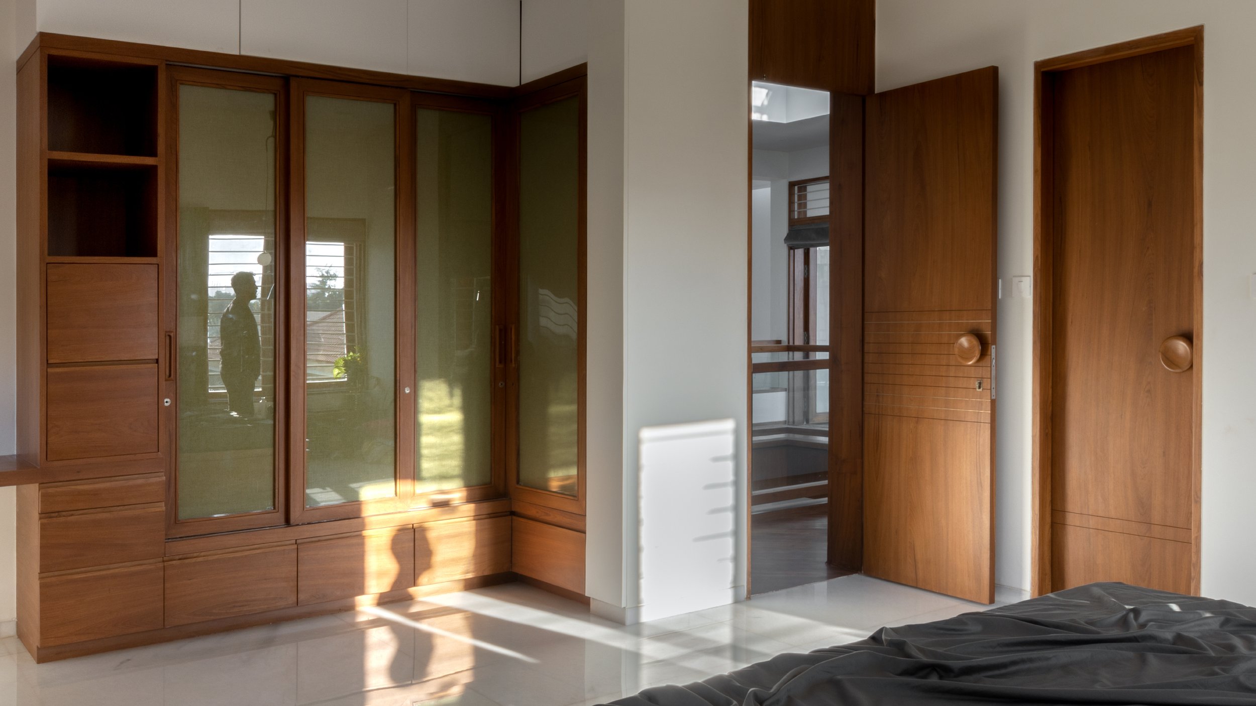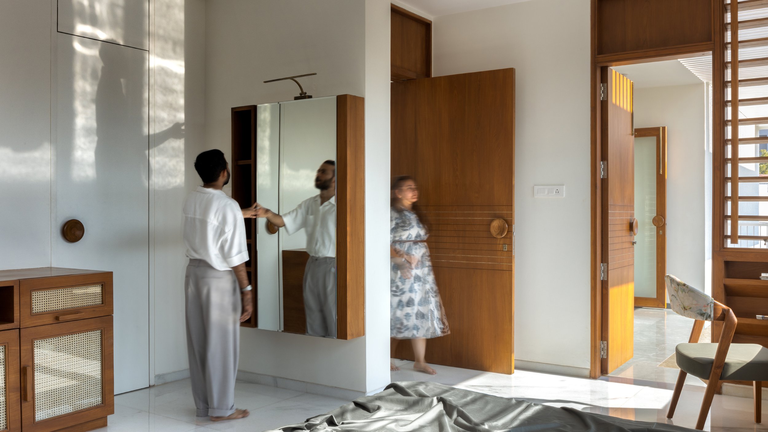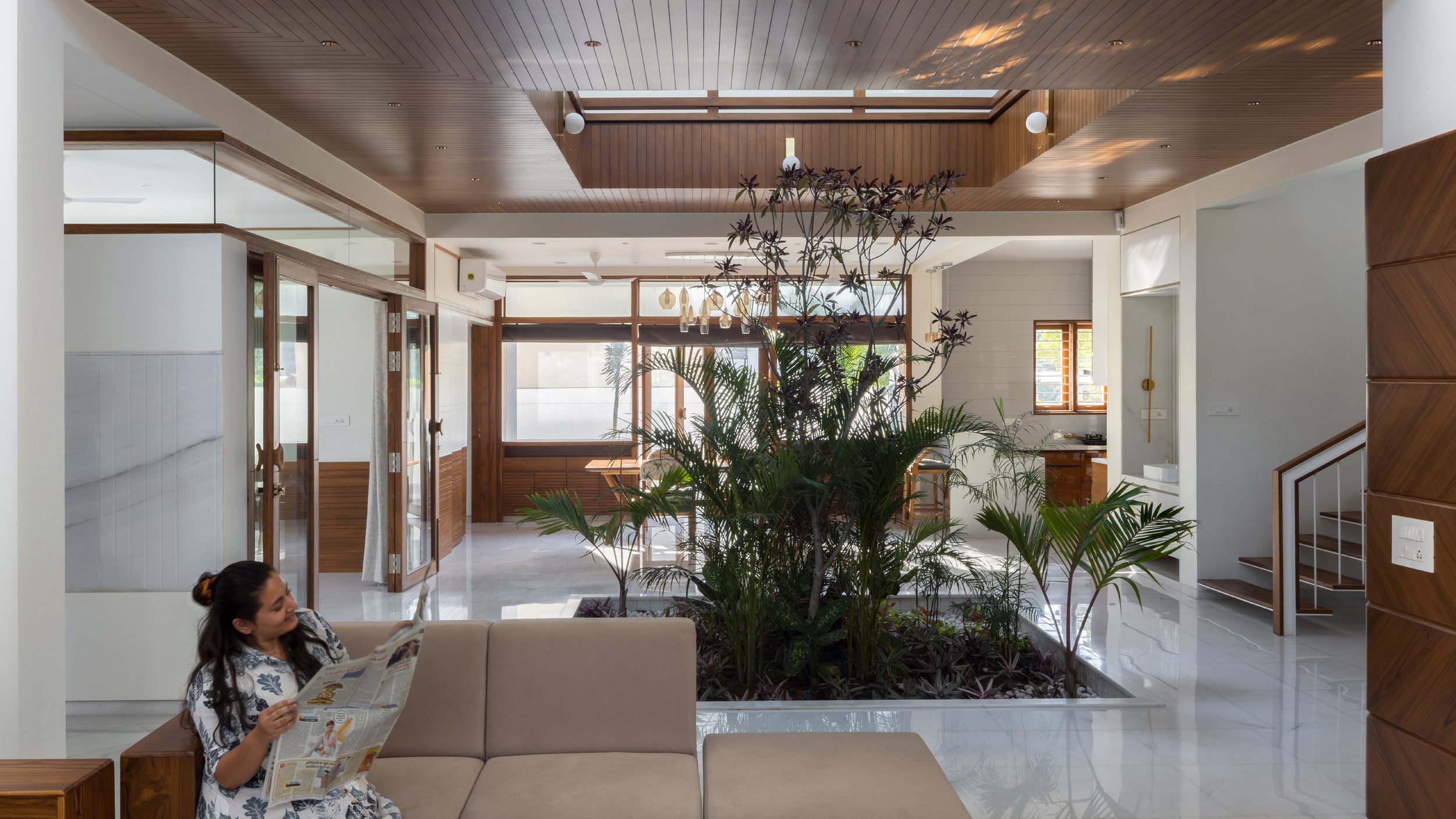 The doors and windows are made from reclaimed wood sourced from a demolished church in a nearby village. White walls and white marble, along with wood and plants make a more earthen Gandhian neutral palette. In this house, light plays with materials and creates a dynamic environment throughout the day, allowing users to occupy the house and make it into a home.