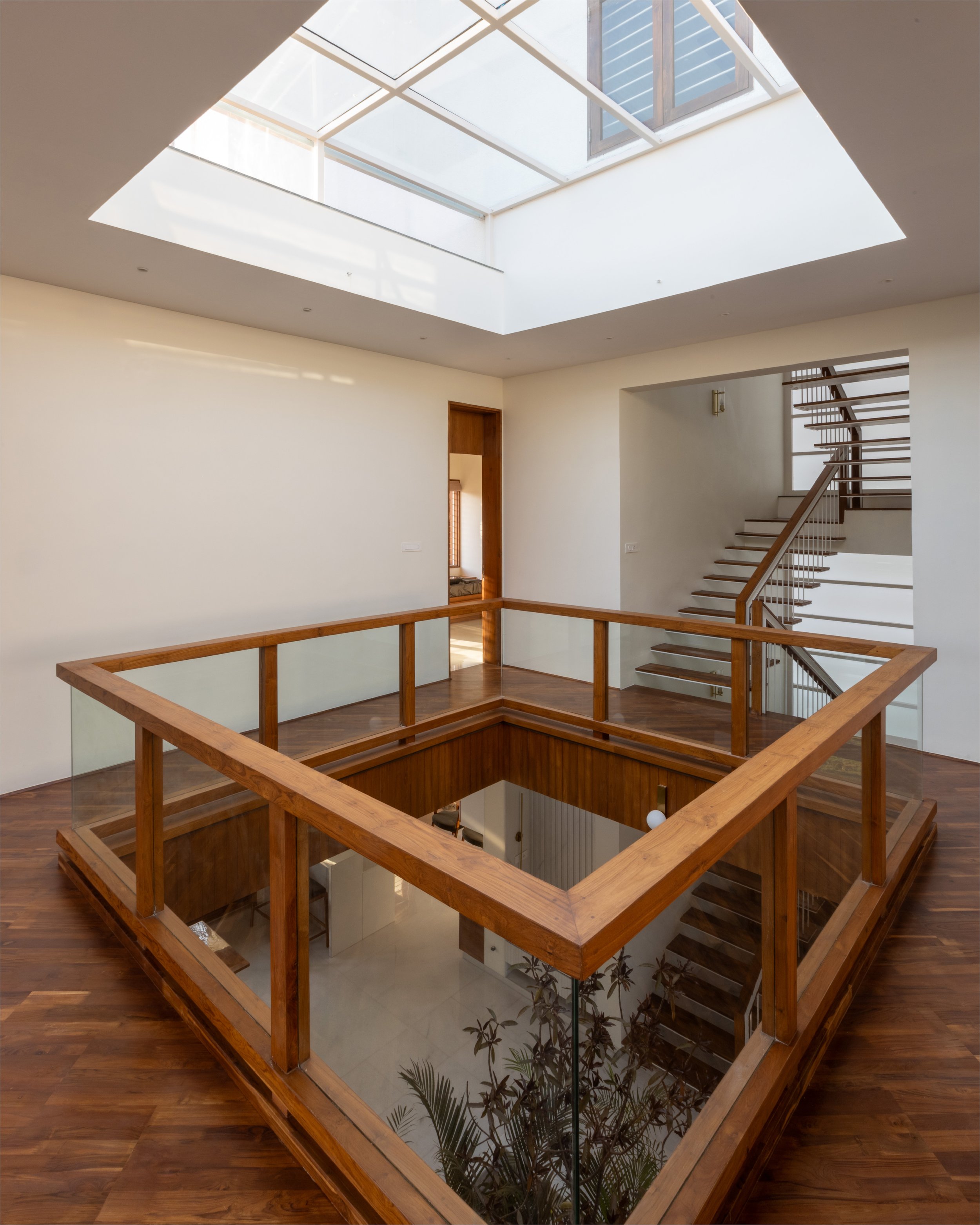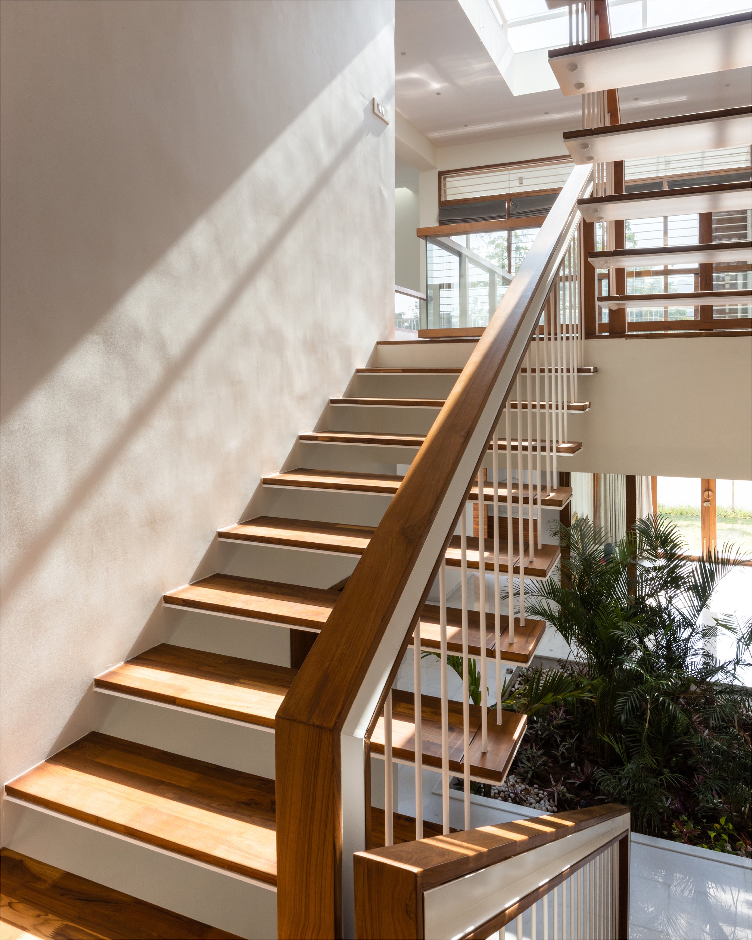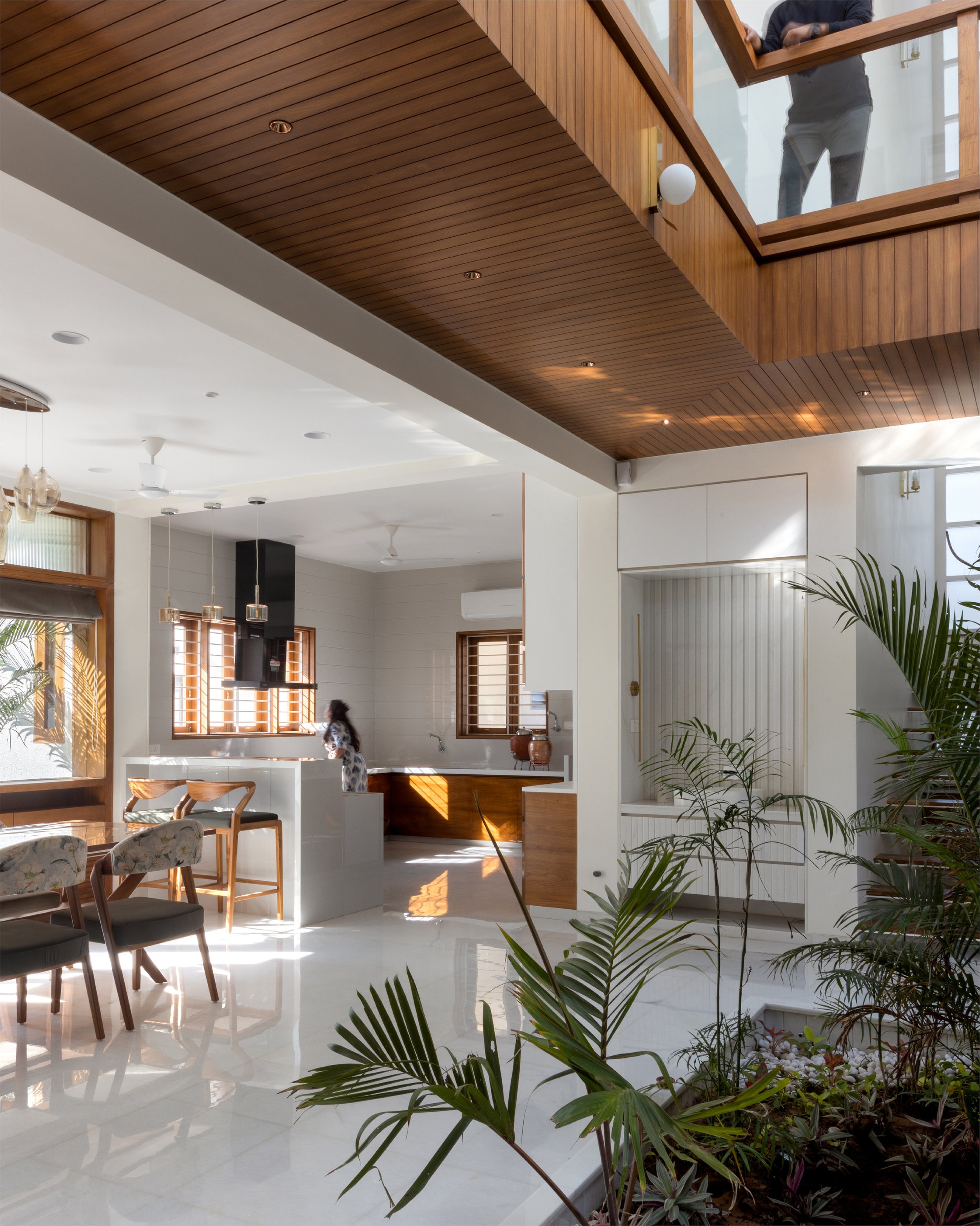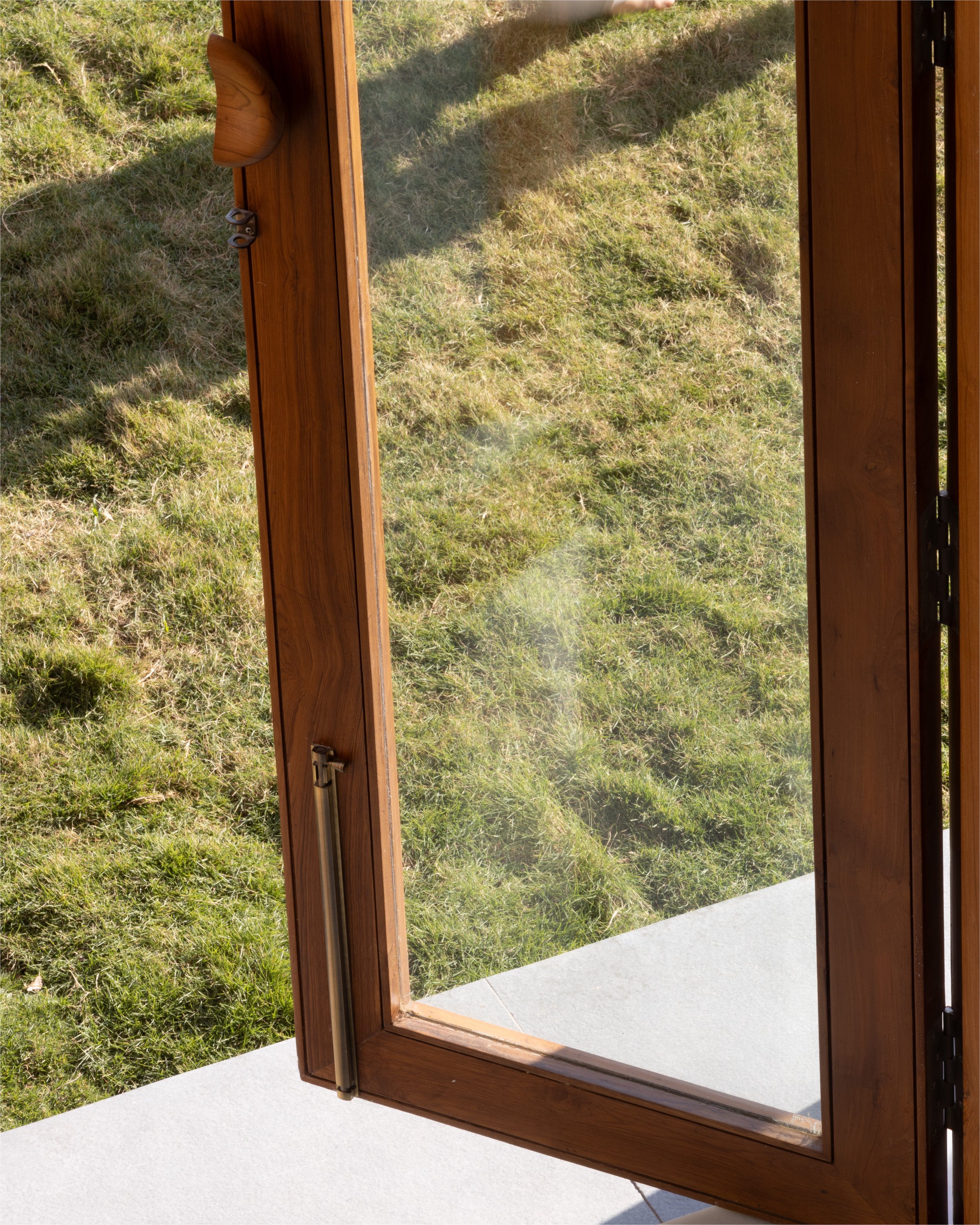 The doors and windows are made from reclaimed wood sourced from a demolished church in a nearby village. White walls and white marble, along with wood and plants make a more earthen Gandhian neutral palette. In this house, light plays with materials and creates a dynamic environment throughout the day, allowing users to occupy the house and make it into a home.