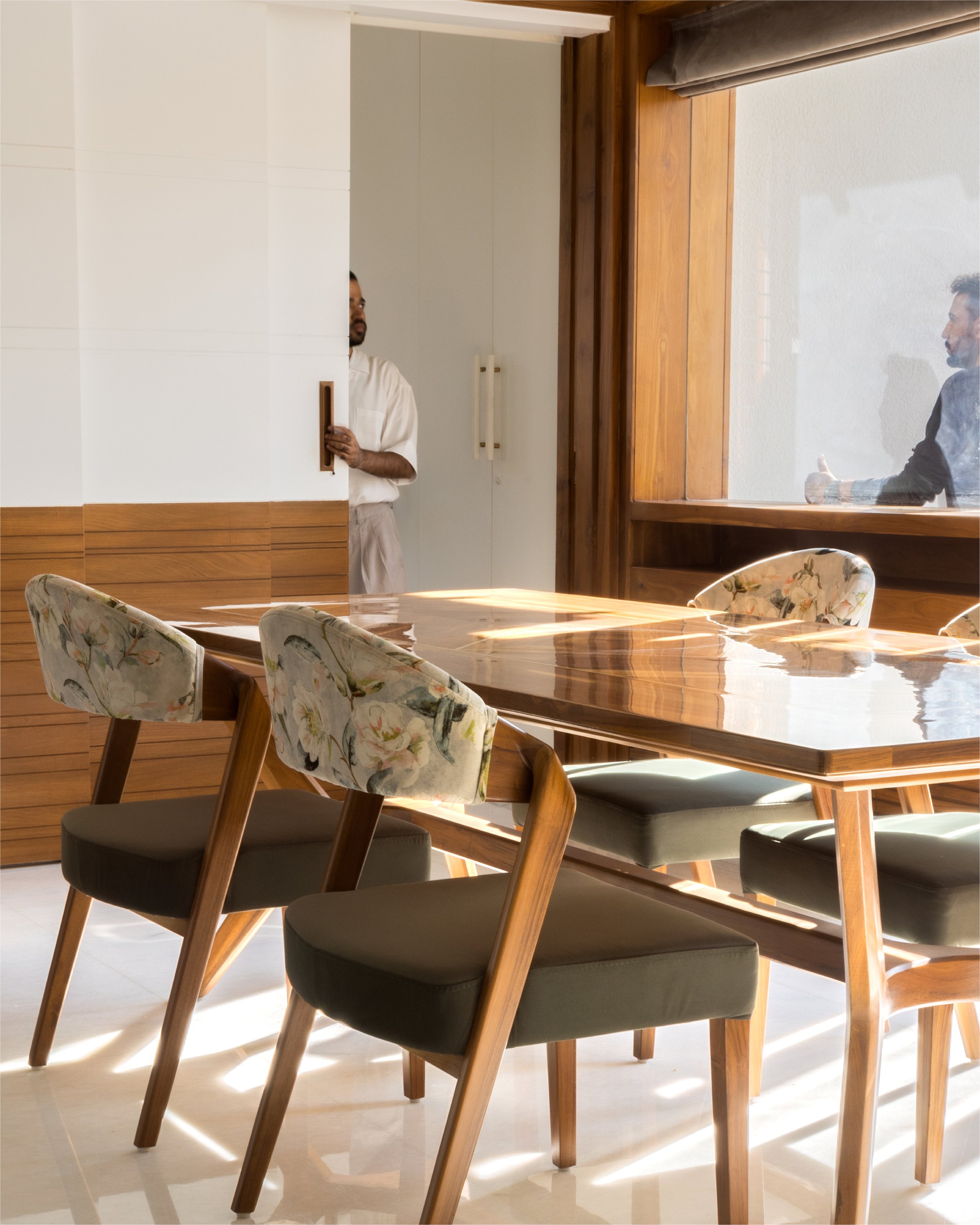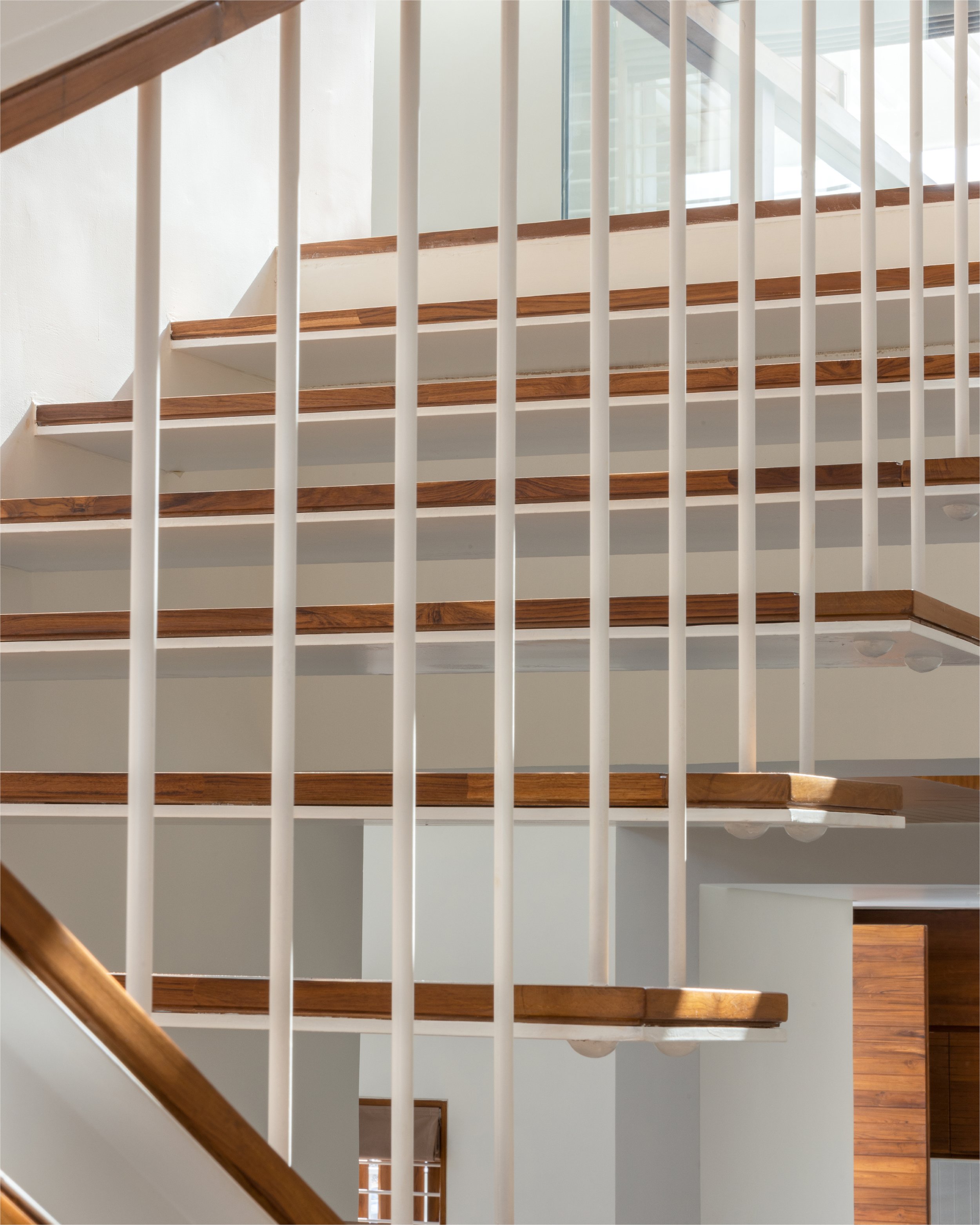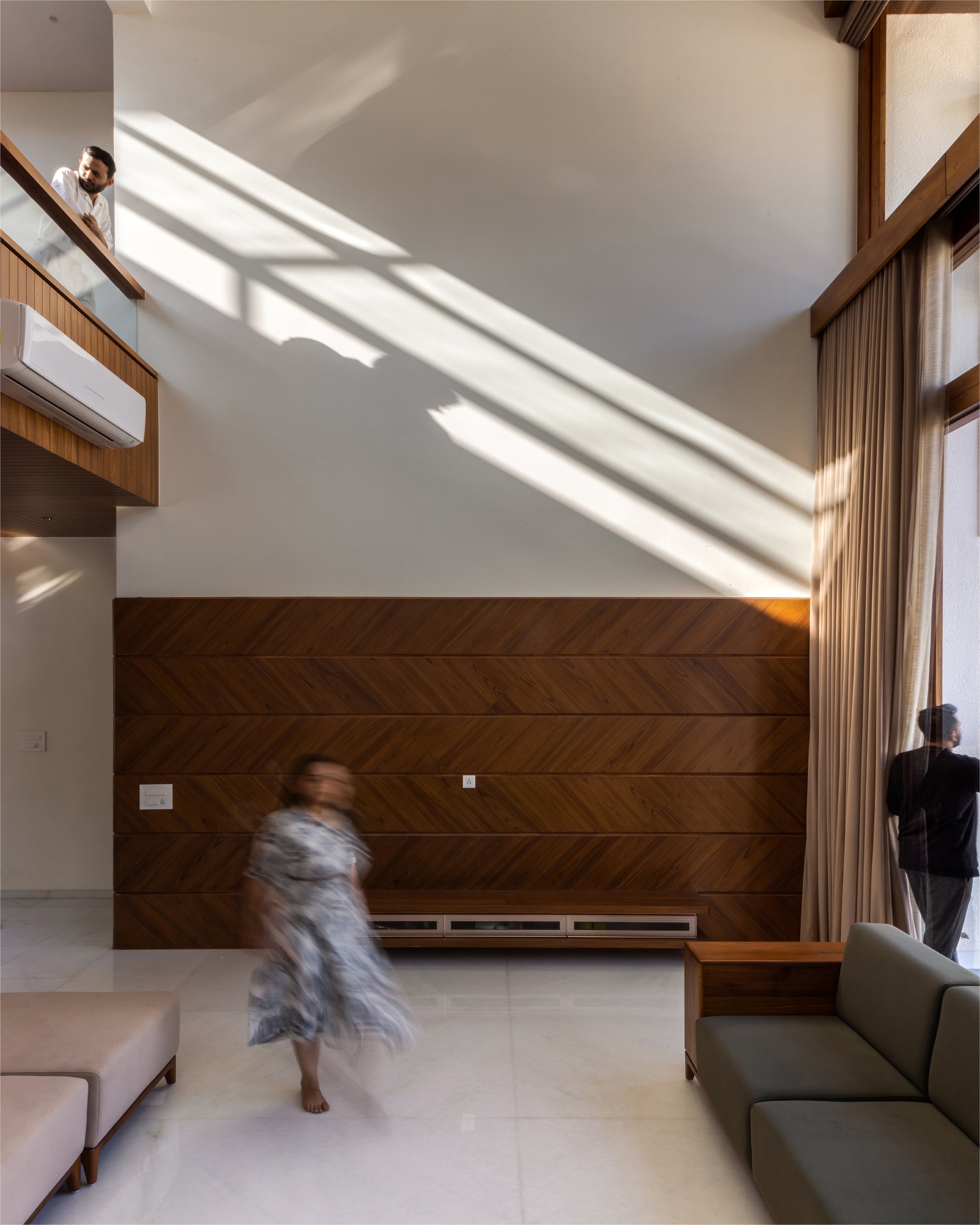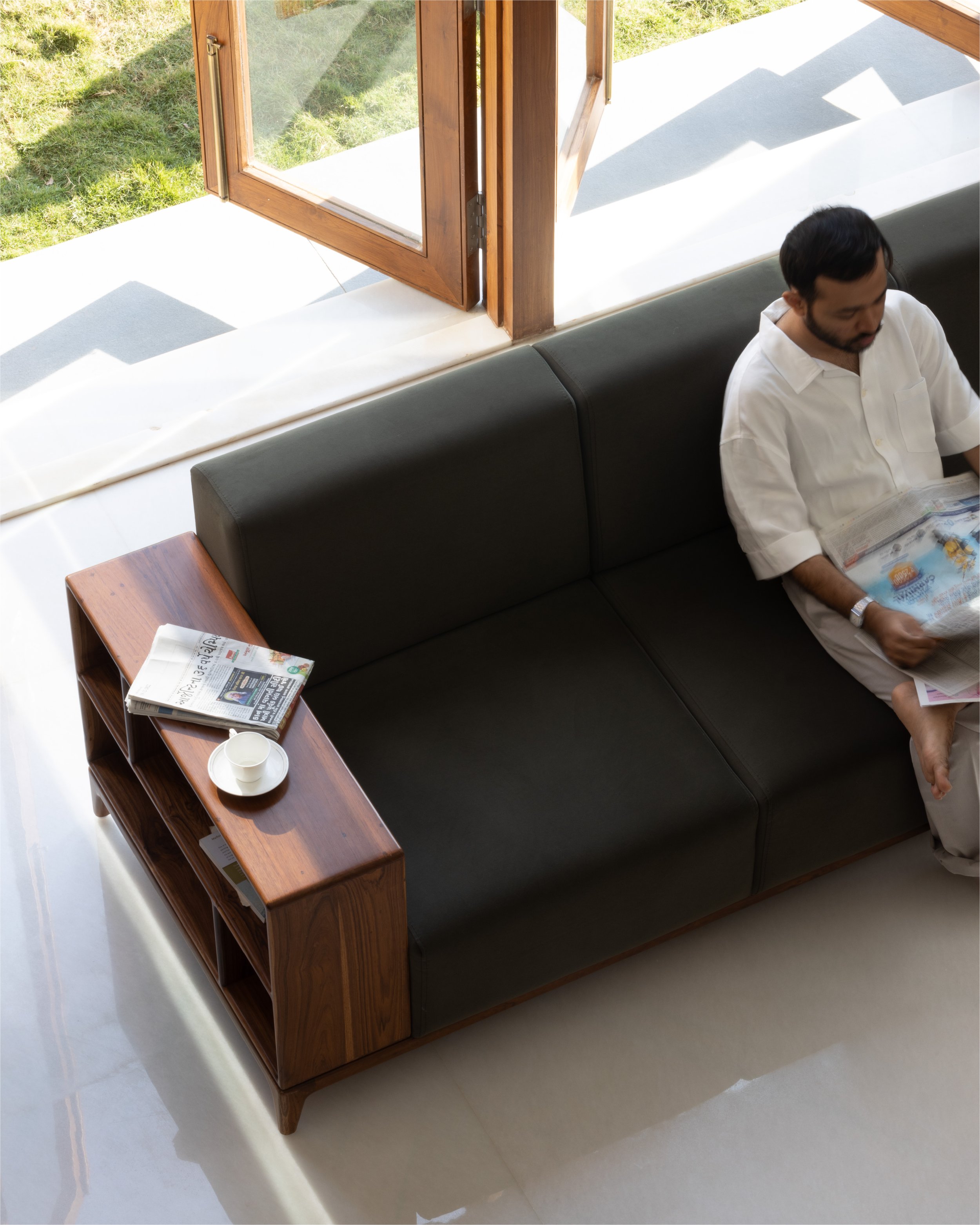 The doors and windows are made from reclaimed wood sourced from a demolished church in a nearby village. White walls and white marble, along with wood and plants make a more earthen Gandhian neutral palette. In this house, light plays with materials and creates a dynamic environment throughout the day, allowing users to occupy the house and make it into a home.